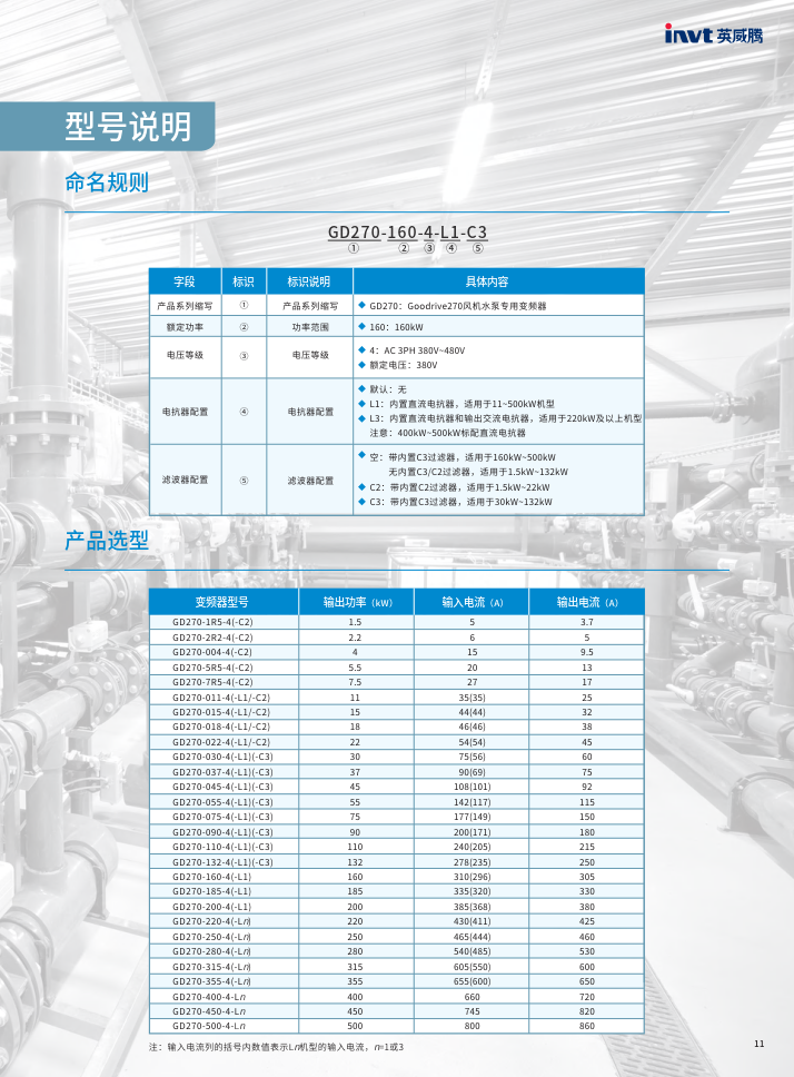 GD270 : 系列代号,Goodrive270系列,是英威腾专为风机、水泵、压缩机等平方转矩负载设计的通用变频器。