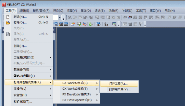 3.2打开FX3G的工程([工程]>[打开其他格式文件]>[GX Works2格式]>[打开工程]>选择工程(***.gxw)