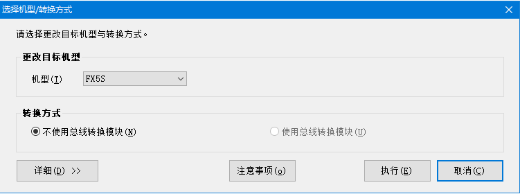 3.3此时会显示以下画面显示以下更改目标机型和转换方式的选择画面。选择更改目标机型和转换方式后,请按[执行]按钮。
